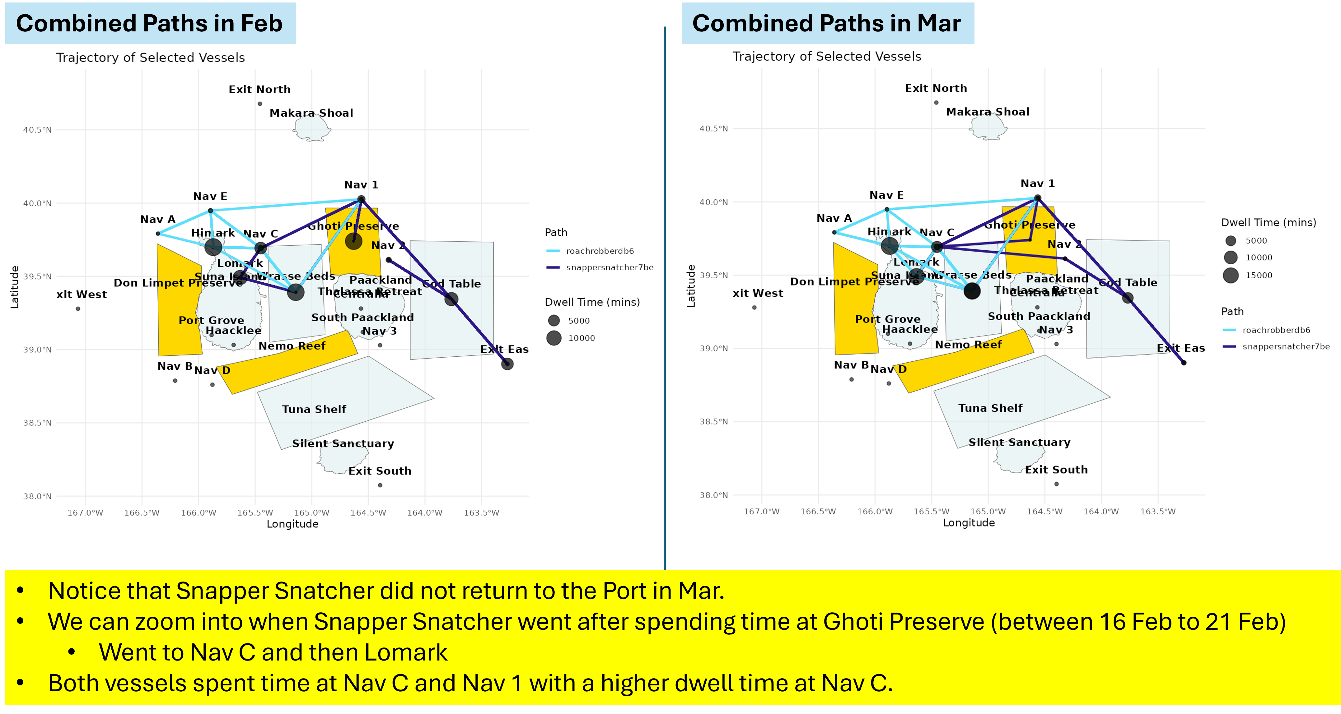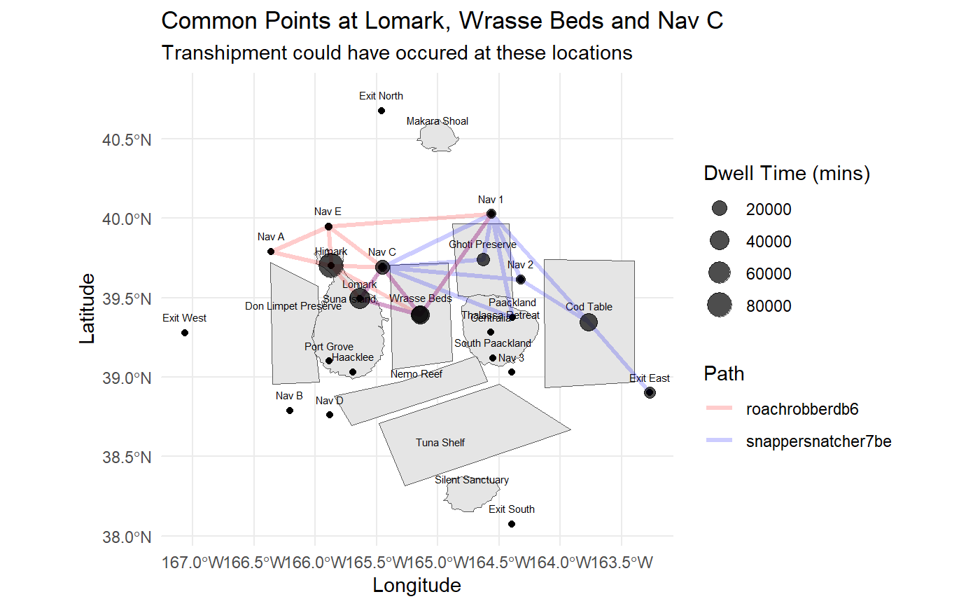 Possibility of Transshipment - Snapper Snatcher is a small vessel and it is unlikely that they are able to hold so many catch within their vessel. Their timing and location with Roach Robber do coincide and we think that there is a possibility of transshipment, especially at the Nav points.