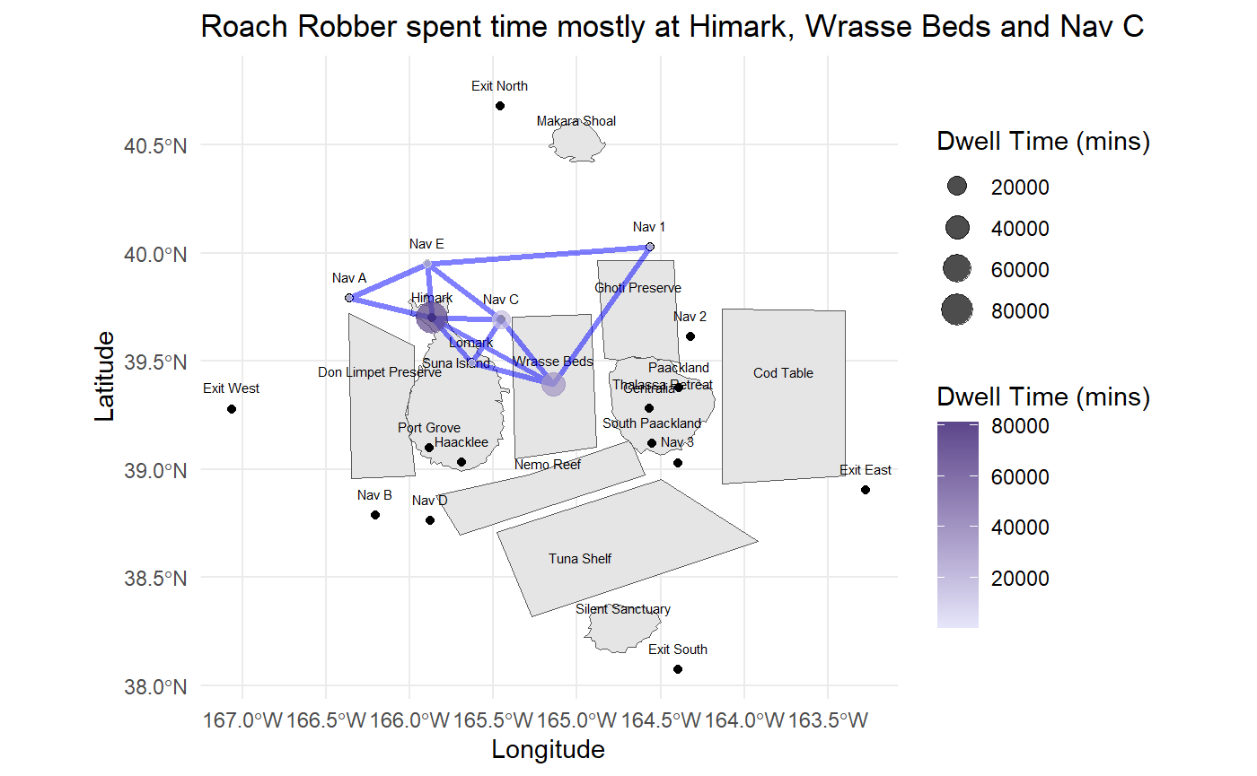 Interestingly, Roach Robber did not spend substantial time at the preserve areas, sticking to mostly being in the port, Wrasse Beds and at Nav C.