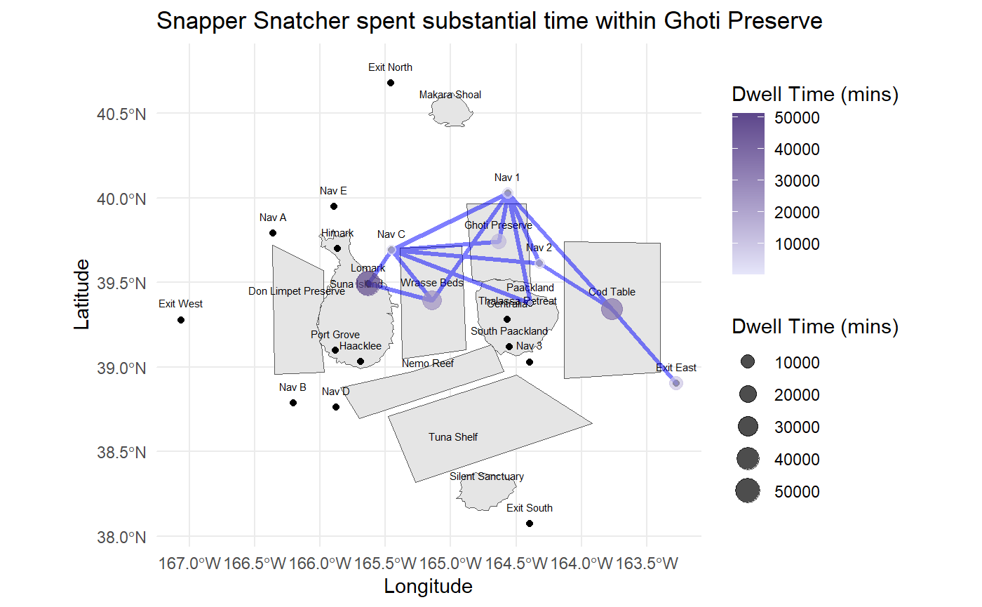 Snapper Snatcher spent subtantial time at the Ghoti Preserve. Given such a high dwell time, it would likely mean that they were illegally fishing there.