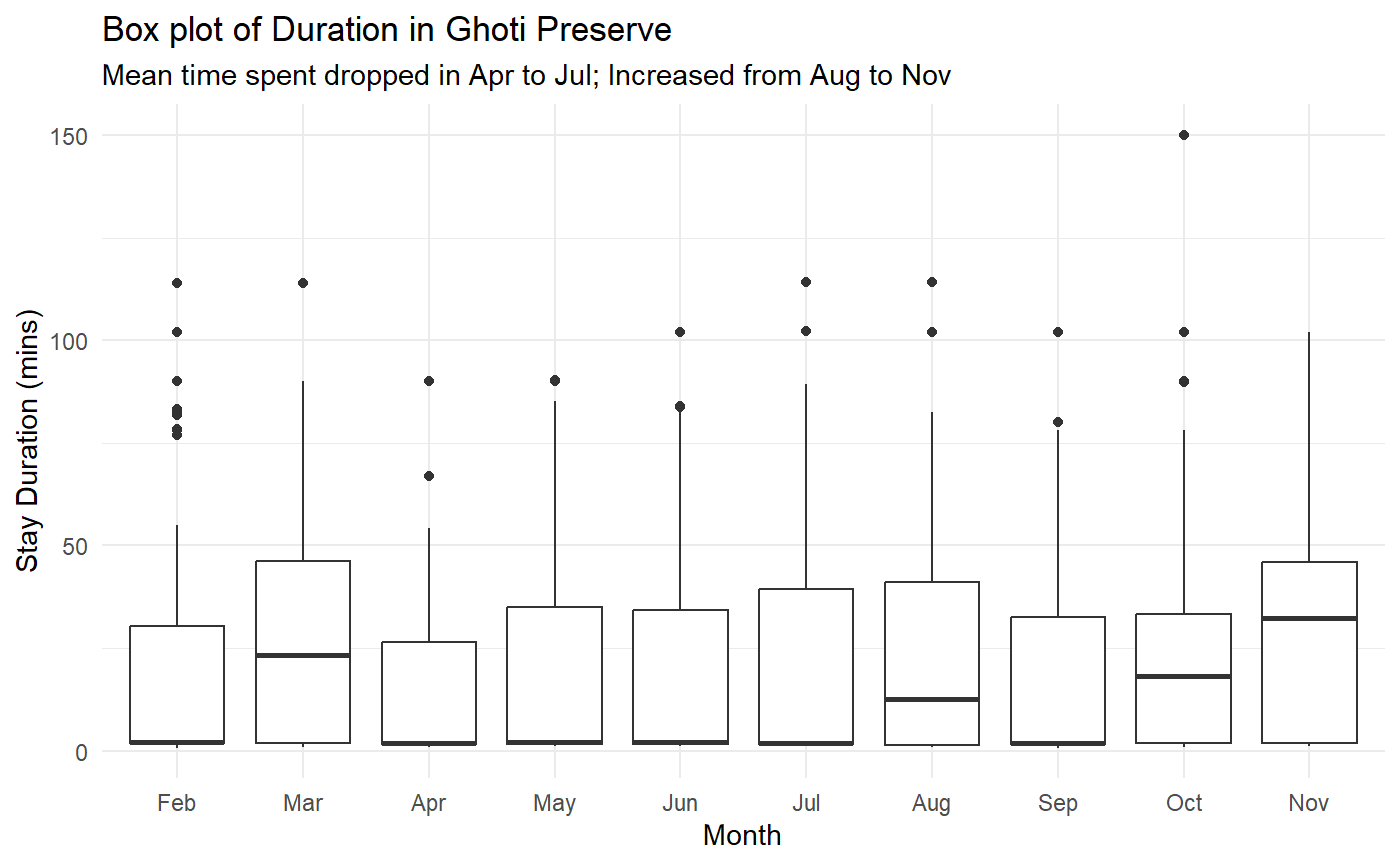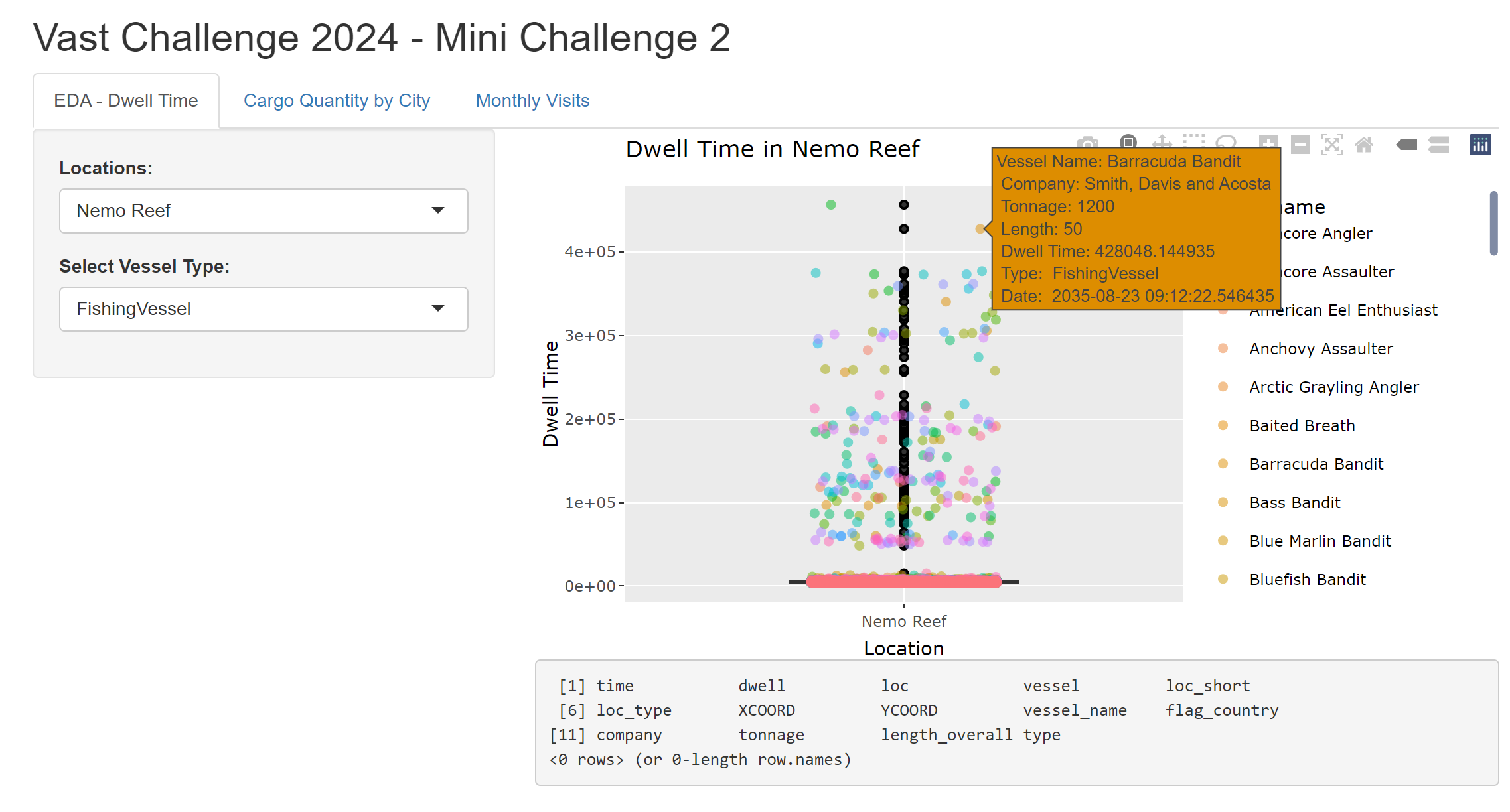 This is further enhanced with the interactivity from the ShinyApp. As we look at the boxplot, we would be able to hover over those outliers and quickly identify the vessels. This would help us to quickly understand which vessels are spending more time than usual at any specific areas.