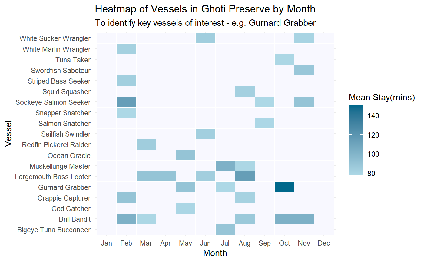 From the earlier analysis, we note that vessels which spend a longer time at preserve areas may be engaging in IUU fishing. For the analysis below we look at the Ghoti Preserve, looking at the number of unique vessels which went into Ghoti Preserve, and their mean stay duration in hours.